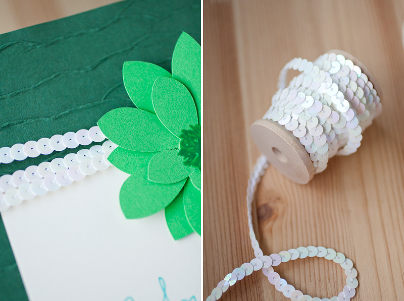 Inspired by yesterday’s inspiration palette, today I bring you a super simple gift wrap idea — a paper succulent coordinated with crumpled paper and sequins. The succulent is four layers with some green glue brushed into the middle. A sheet of crumpled paper was glued atop a kraft box, perfect for those folks who don’t like wrapping up gifts in wrapping paper.